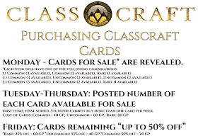 I was hooked from the moment of creating my first card.  The creativity aspects of things were limitless and I had a good feeling that these cards were the aspect that would add that little "extra" element to each of my class's Classcraft gameplay.  In addition to the abilities and fun aspects of that the cards added to the game, I also made each cards have a "level," requiring the student using the card to not only have the GP (or GP + AP) to "cast" the card, but also to be of a certain level to do so.  This was done with the goal of motivating students to want to gain XP and level up, if they weren't already actively trying to do so.  I started by first introducing the cards and providing them, at random, as incentives for doing well and by adding a random event in Classcraft to win them as well, calling it "Play the Hand You're Dealt" (1 random remember of each class - warrior, mage, and healer - wins a random Classcraft Card).  When that didn't seem like enough incentive, I followed a similar approach to Jason's AOH game, opening a Classcraft Card store.  Each week I offer up 3 cards following a basic rule of having more quantities of common cards than uncommon or rare cards available for each class.  In addition, the cost to purchase (separate from their casting cost, labeled as "card cost") is higher for rare cards than it is for uncommon or common.  The posting/handout used for this store is shown below.